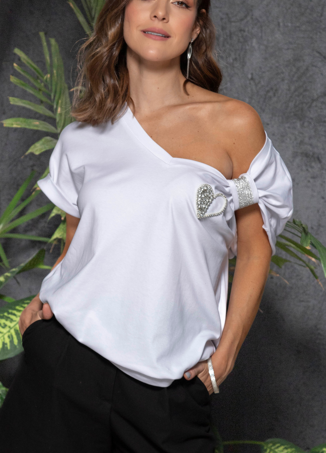 T-shirt cuello V con aplique y asa desprendible y reversible.