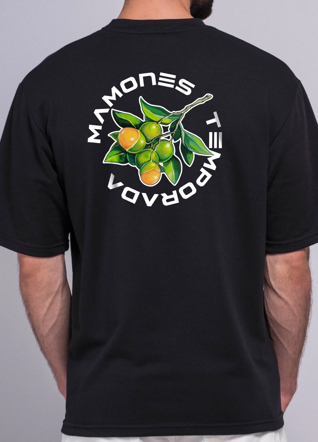 T-shirt cuello redondo estampada en versión pequeña, frontal y espalda  sobre fondo negro.